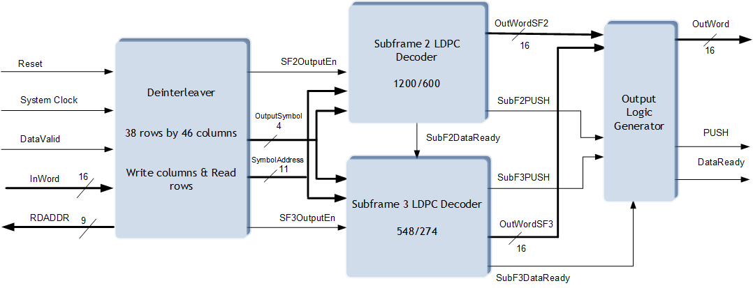 The VK3061 LDPC IP implements the error correction module in the GPS receiver, as well as the memories. It integrates the de-interleaver, subframe 2 LDPC decoder and subframe 3 LDPC decoder with both the DPRAM and the FIFO. The block diagram for the LDPC IP is shown in the Figure. 1.